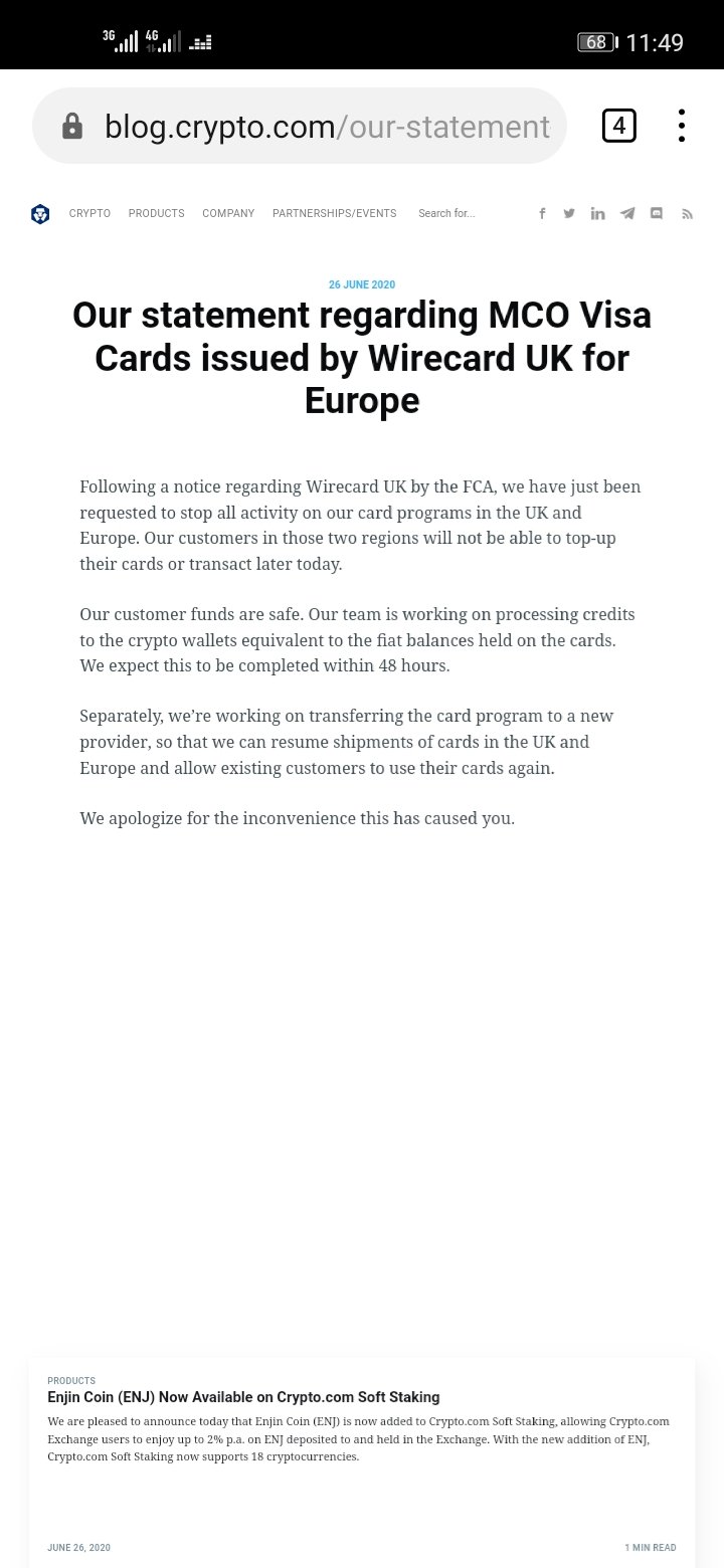 Crypto Com On Twitter Our Statement Regarding Mco Visa Cards Issued By Wirecard Uk For Europe Https T Co Mabccbbngk Twitter